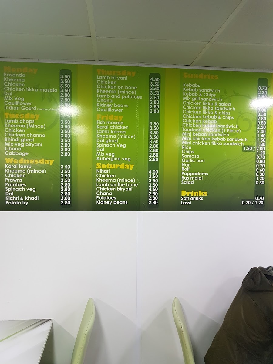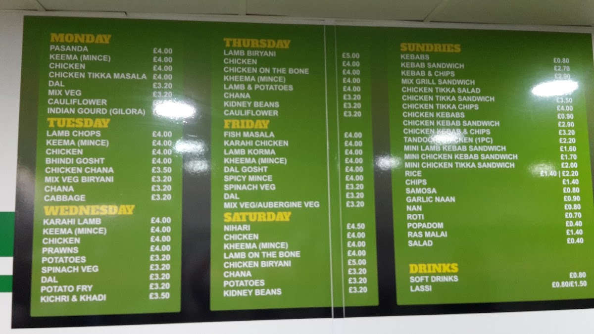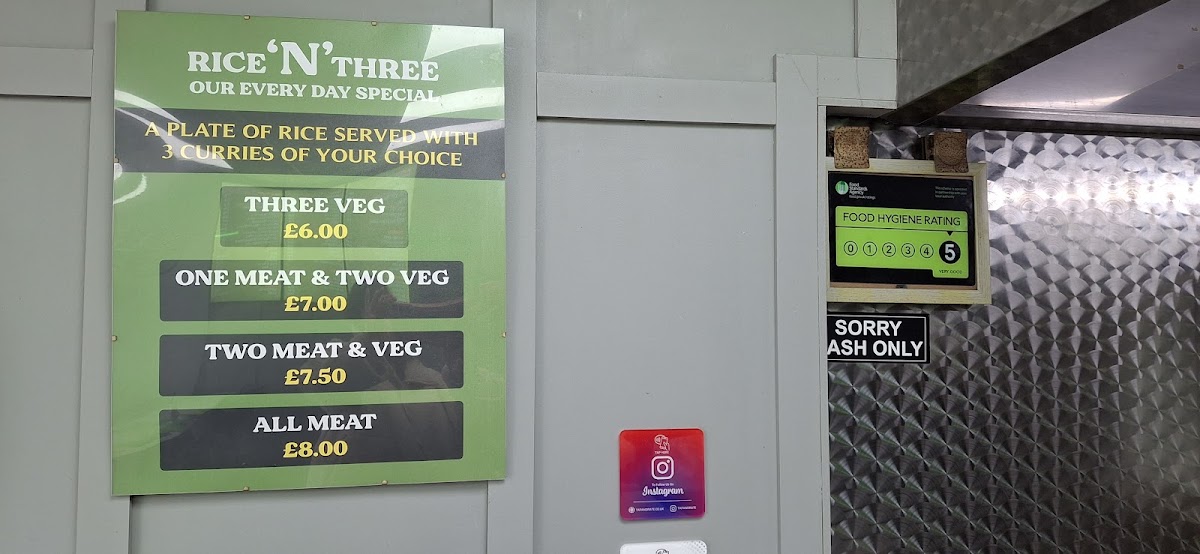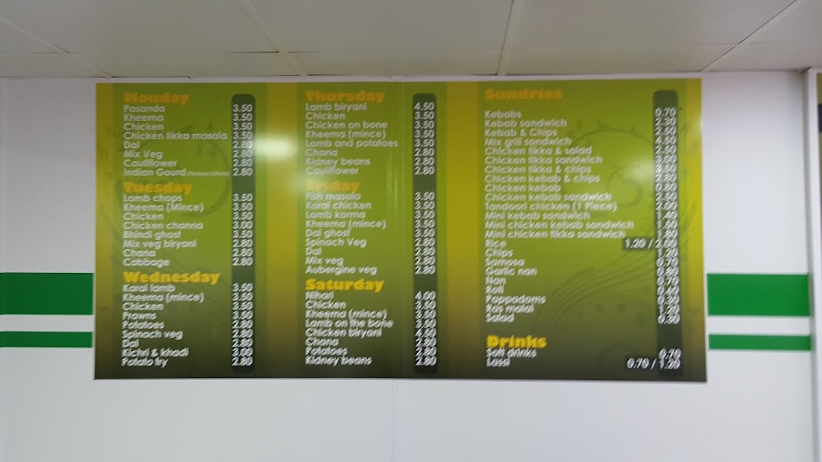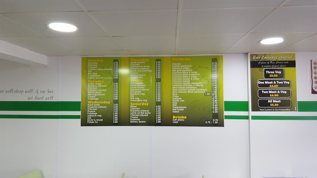 The menu at Rice 'n' Three offers a delightful variety of dishes, catering to a range of tastes. Each day features a rotating selection of flavorful meals, such as the Pasanda, Keema, and Chicken Tikka Masala on Mondays, and the hearty Lamb Biryani and Chicken On The Bone on Thursdays. Friday brings crowd-pleasers like Fish Masala and Karahi Chicken, while Saturdays showcase dishes like Nihari and Chicken Biryani. The restaurant also offers an array of sundries such as Rice, Chips, Samosa, and Garlic Naan, perfect for pairing with main dishes. For those seeking a satisfying meal from the grill, options like the Lamb Kebab, Kebab Sandwich, and Mix Grill Sandwich are sure to satisfy. The menu includes special combinations like Three Veg, One Meat & Two Veg, and All Meat platters for a complete feast. Additionally, you can enjoy refreshing Soft Drinks or a traditional Lassi to complement your meal. The variety of dishes, from comforting Dal Gosht to the crispy Kebabs, ensures that there's something for everyone at Rice 'n' Three.